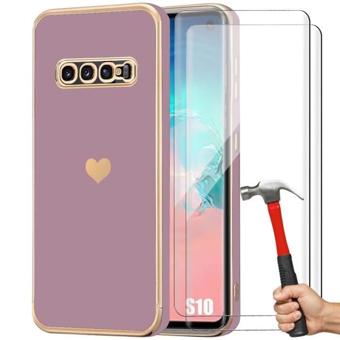 Case for Samsung Galaxy S10 (not for S10 5G), Shockproof Silicone Case with Plated Love Pattern, Purple + 2 Tempered Glasses