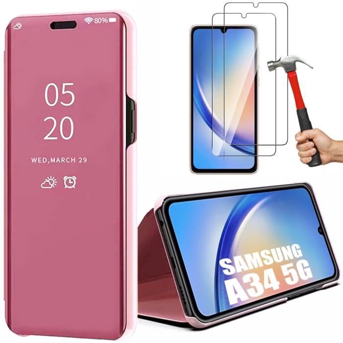 Case - BOOLING - for Samsung Galaxy A34 5G - Pink - with 2 Tempered Glasses - Mirror Effect Protection