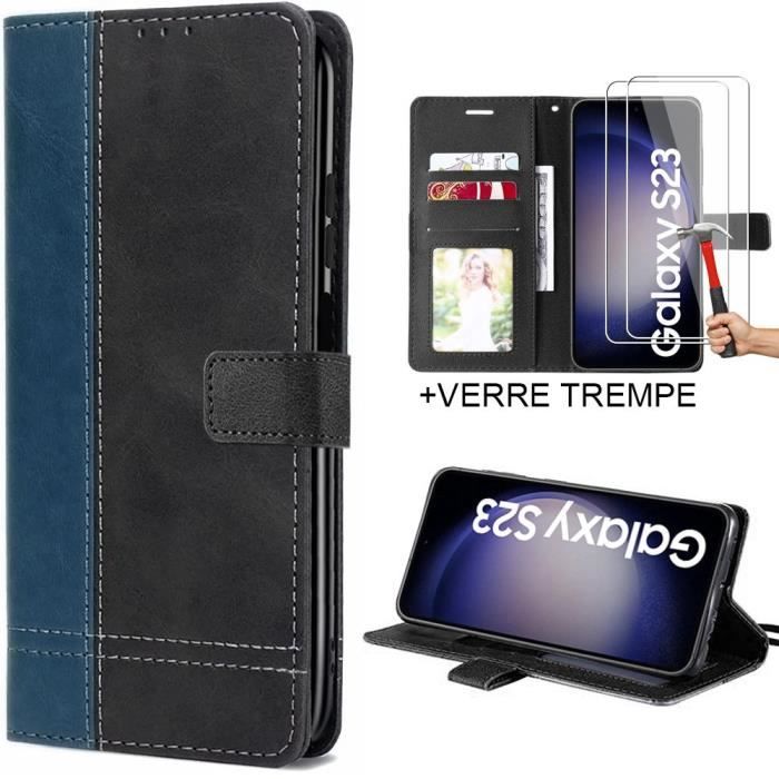 Protective Case for Samsung Galaxy S23 - BOOLING - Navy Blue Leather Effect - 2 Tempered Glass
