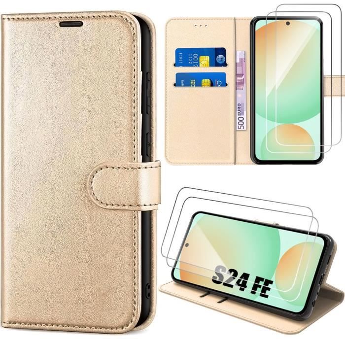 Coque + 2 Verres Trempés pour Samsung Galaxy S24 FE (pas pour S24) - Flip Case Antichoc Cuir Synthétique Doré