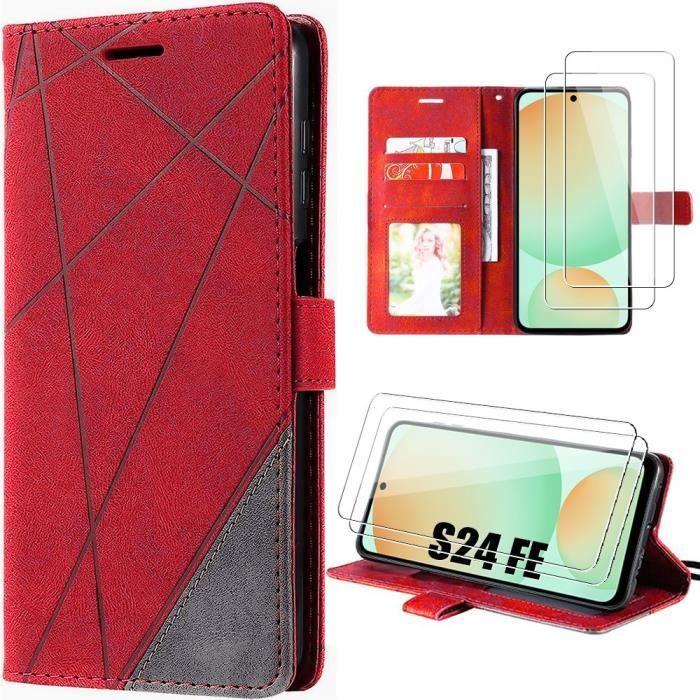 Coque - Booling - pour Samsung Galaxy S24 FE - Cuir Synthétique - Rouge - 2 Verres Trempés