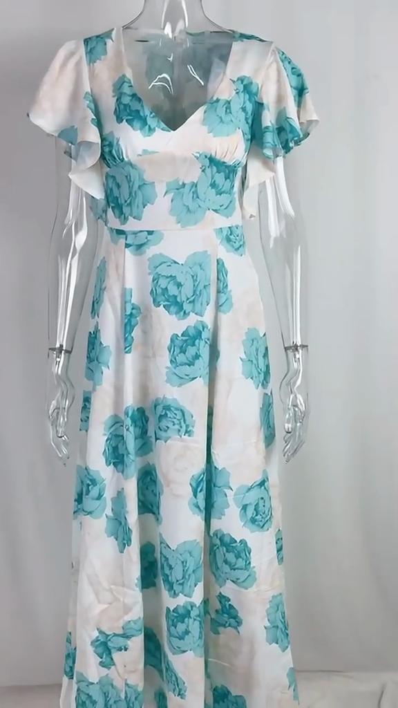 Women's Clothing, V-neck, Cinched Waist, Printed, Large Hem, Dress