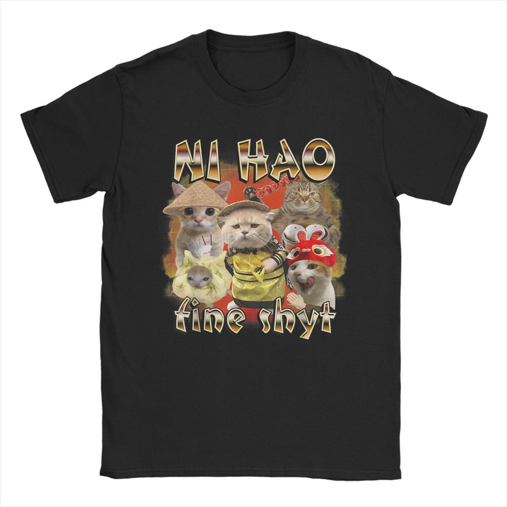 Men's T-Shirt Ni Hao Fine Shyt Funny Brainrot Meme Funny 100% Cotton Tee Shirt Short Sleeve Cute Cat T Shirts Clothing Graphic