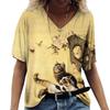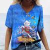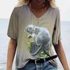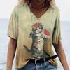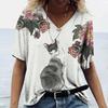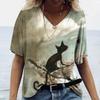2025 Summer New 3D Cat Print Tee Loose Retro Women's V-neck Short Sleeved Street Style T-shirt Casual Top