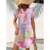 This Women's Geometric Pattern Printed Dress Is Fashionable LooseV-neck Button-down and Short-sleeved