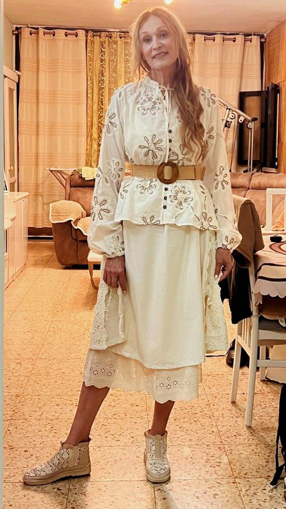 As usual - a bit short, according to Chinese patterns. Polyester. I will wear it with a petticoat