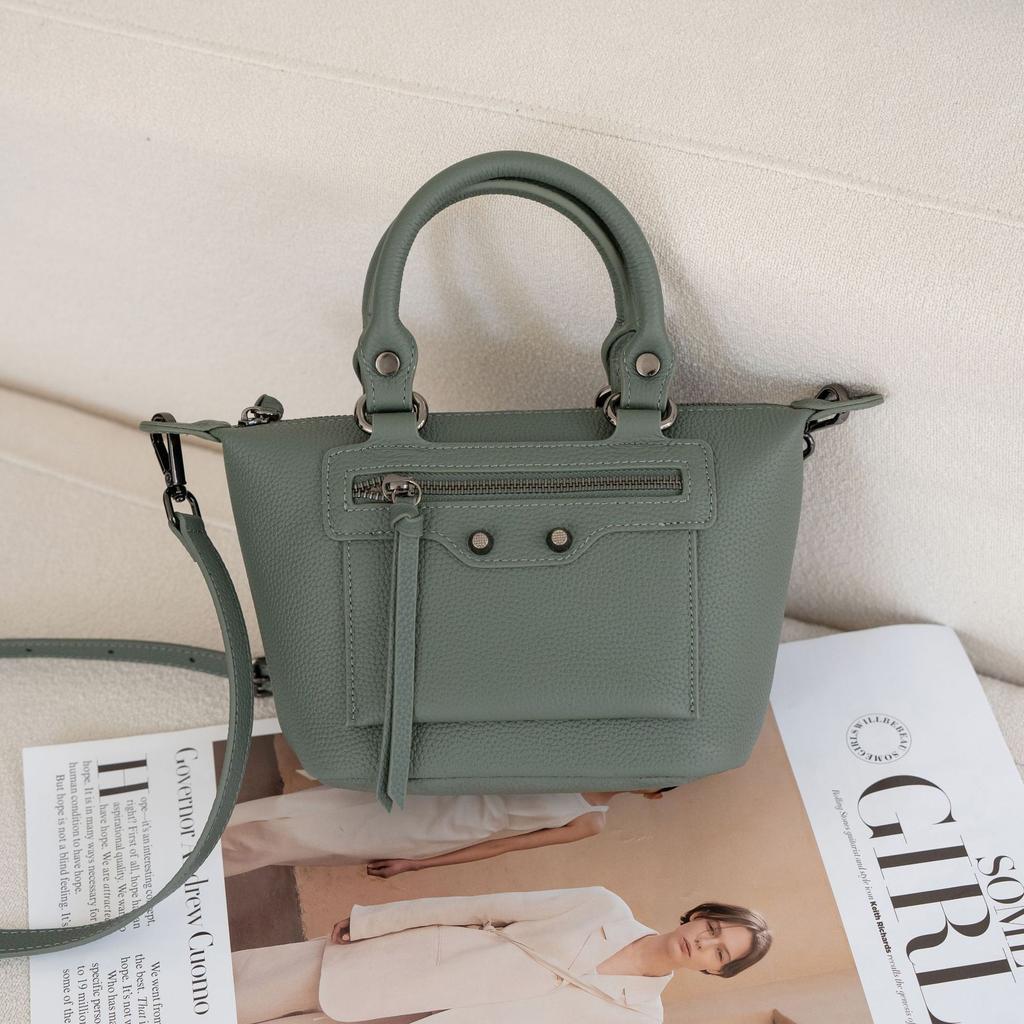 - This handbag features a chic and compact silhouette with a structured design. The TOGO top - grain cowhide material gives it a smooth and luxurious texture. It is adorned with metallic studs and a front zipper pocket, along with tassel details, adding a trendy and stylish touch. The bag comes with a top handle and a detachable shoulder strap, available in a range of vibrant and classic colors.