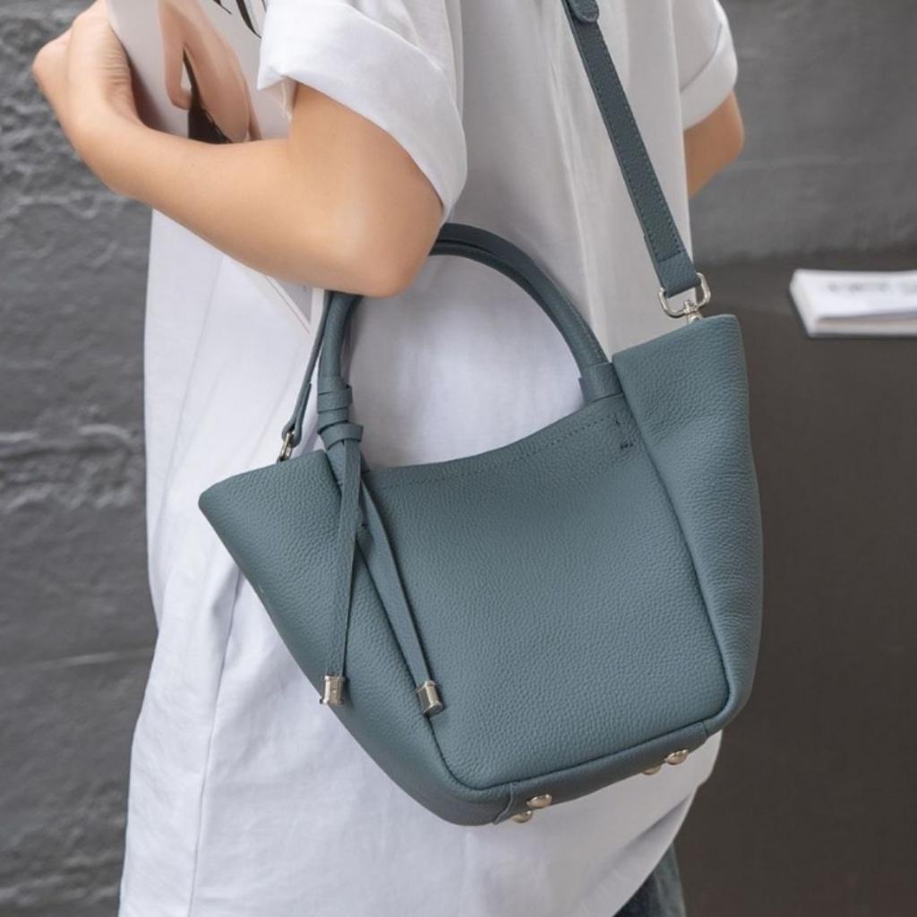 - This handbag showcases a fashionable bucket - style silhouette. The Togo top - grain cowhide material endows it with a soft, pebbled texture and a luxurious look. It is equipped with sturdy top handles and a detachable, adjustable shoulder strap. The bag features a simple yet elegant design with a drawstring - like detail on the top, adding a touch of style, and is available in a variety of soft and trendy colors.