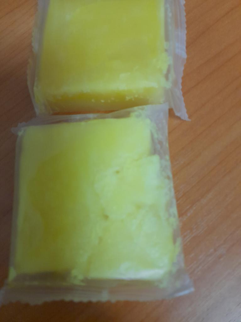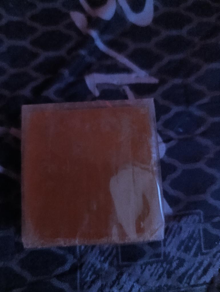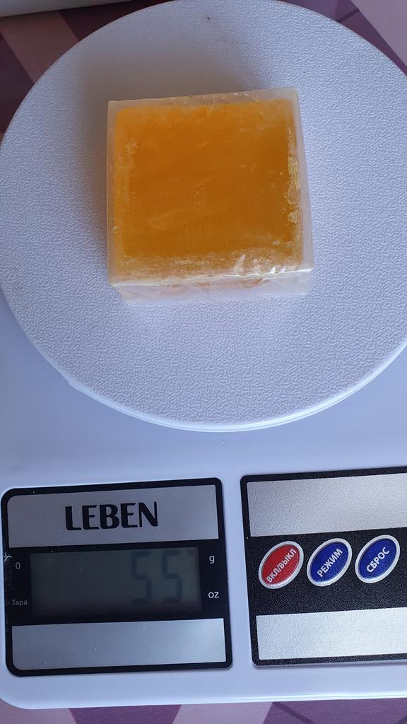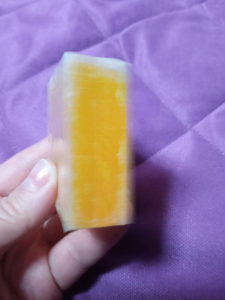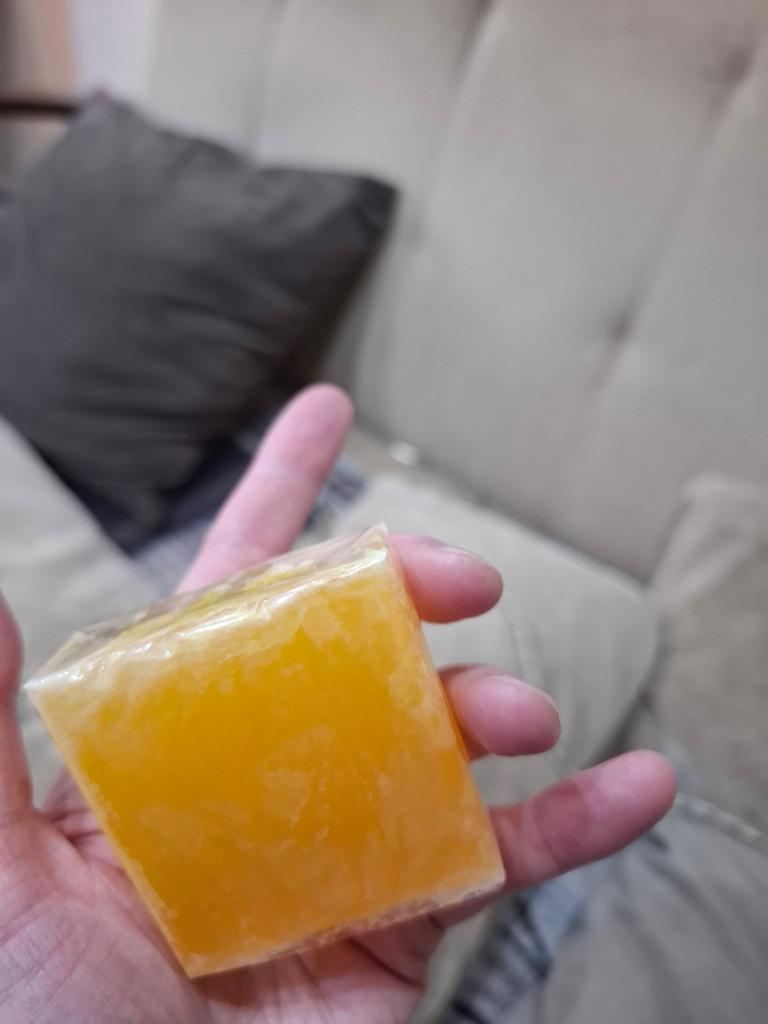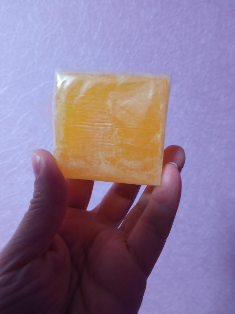 Long live the fragrant soap...Yellow and transparent, pleasant smell, but small, like handmade soap.