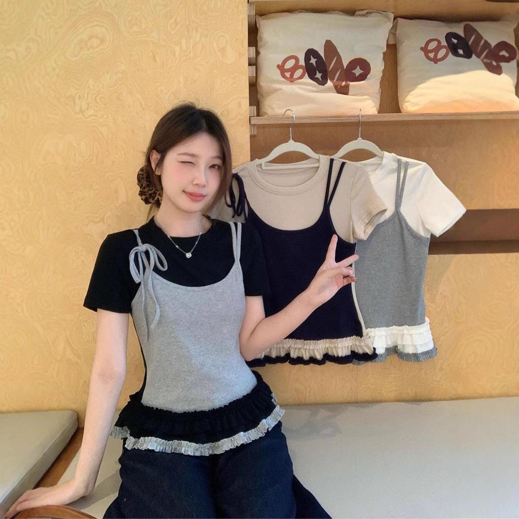 Elevate your wardrobe with this chic mock two-piece T-shirt, featuring a sophisticated contrast stitch design. Crafted from soft viscose material, the T-shirt combines comfort and style effortlessly. The playful color block pattern and delicate bowknot decoration enhance its modern flair, while the ruffled edges add a touch of feminine charm. With a classic round neckline and short sleeves, this T-shirt seamlessly blends elegance with everyday wearability. Perfect for a casual outing or a relaxed day at home, it is a versatile addition to any fashion-forward individual's collection.
