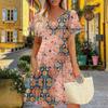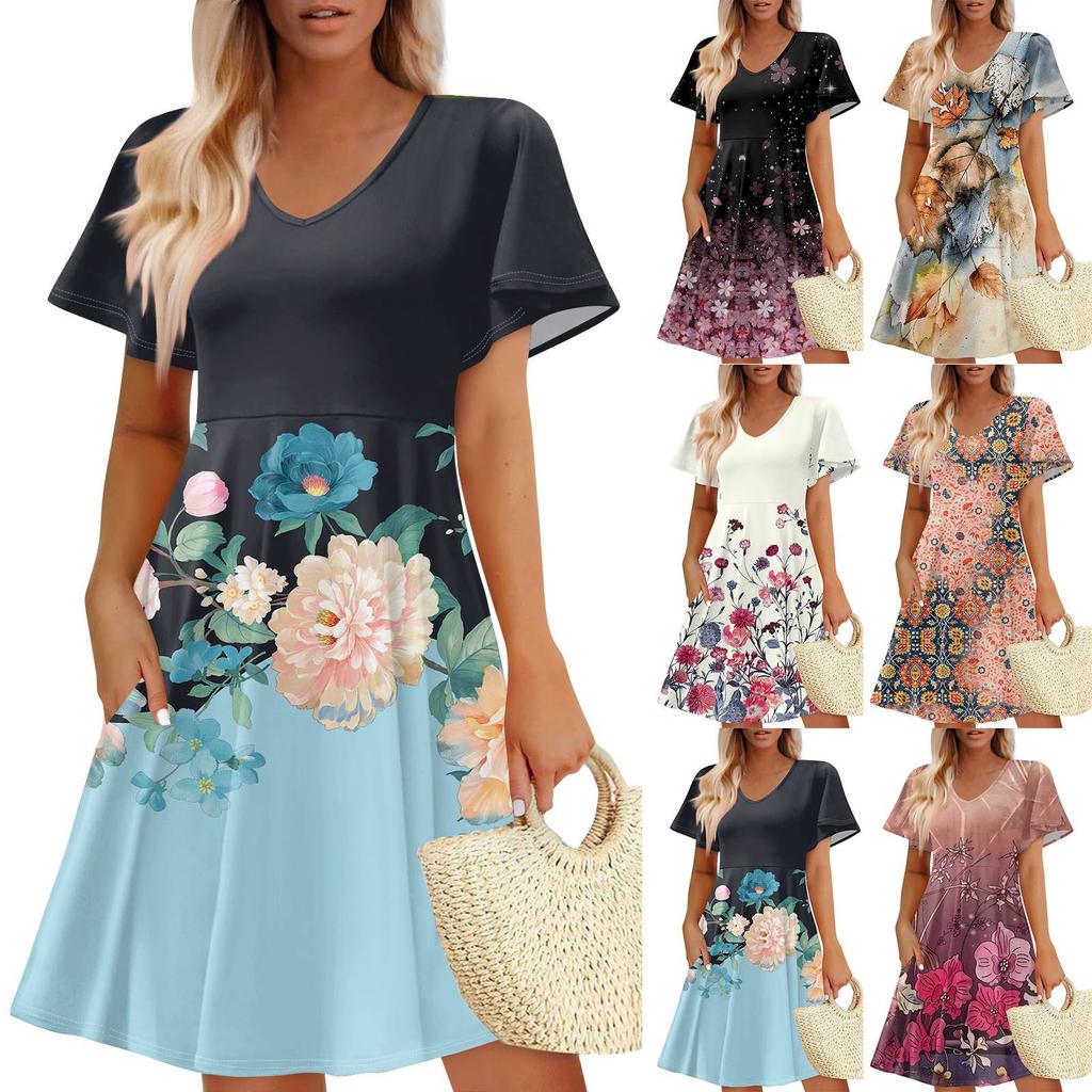 Women Summer Dress Casual Swing Floral Ruffle Short Sleeve Sundresses Beach A-line Dress With Pockets