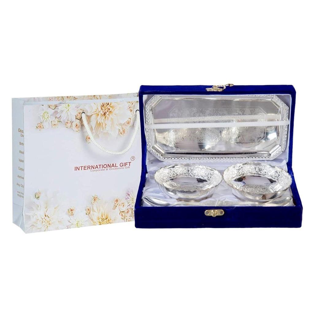 German Silver Brass Round Bowl Sets with Tray and Spoon with Royal Royal Luxury Velvet Box