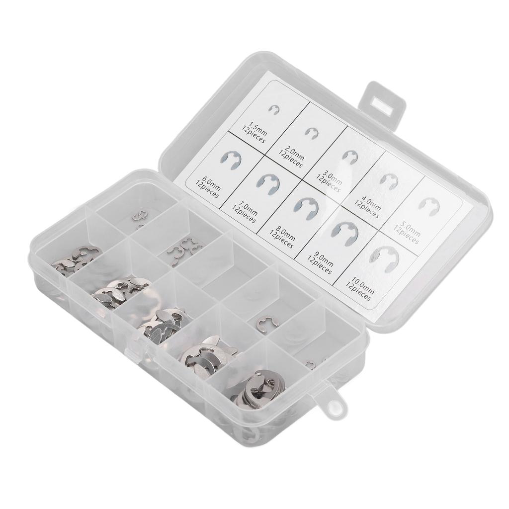 12 x M1.5 E Clip12 x M2 E Clip12 x M3 E Clip12 x M4 E Clip12 x M5 E Clip12 x M6 E Clip12 x M7 E Clip12 x M8 E Clip12 x M9 E Clip12 x M10 E Clip1 x Storage BoxRetainer Ring: The E clip fastener with an opening on one side to fix the part on a shaft with a wider shoulder, thus providing larger fixed area and higher thrust load capacity.