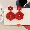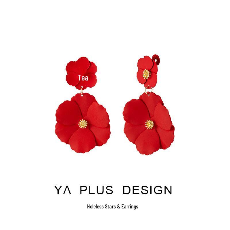Red Retro Hong Kong Style Long Flower Earrings, Festive Mosquito Coil Ear Clips for Non-Pierced Ears