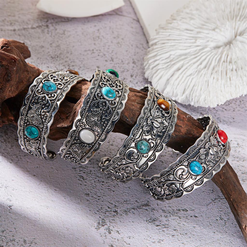Vintage Antique Silver Color Natural Stone Wide Bangles Bracelets For Women Chinese Style Retro Gold Color Cuff Bracelet Jewelry