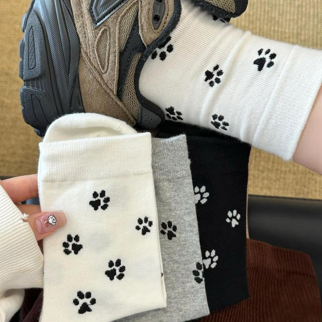 3 Pairs Cute Cartoon Dog Paws Socks - All-Match Middle Tube Korean Style College Socks for Women