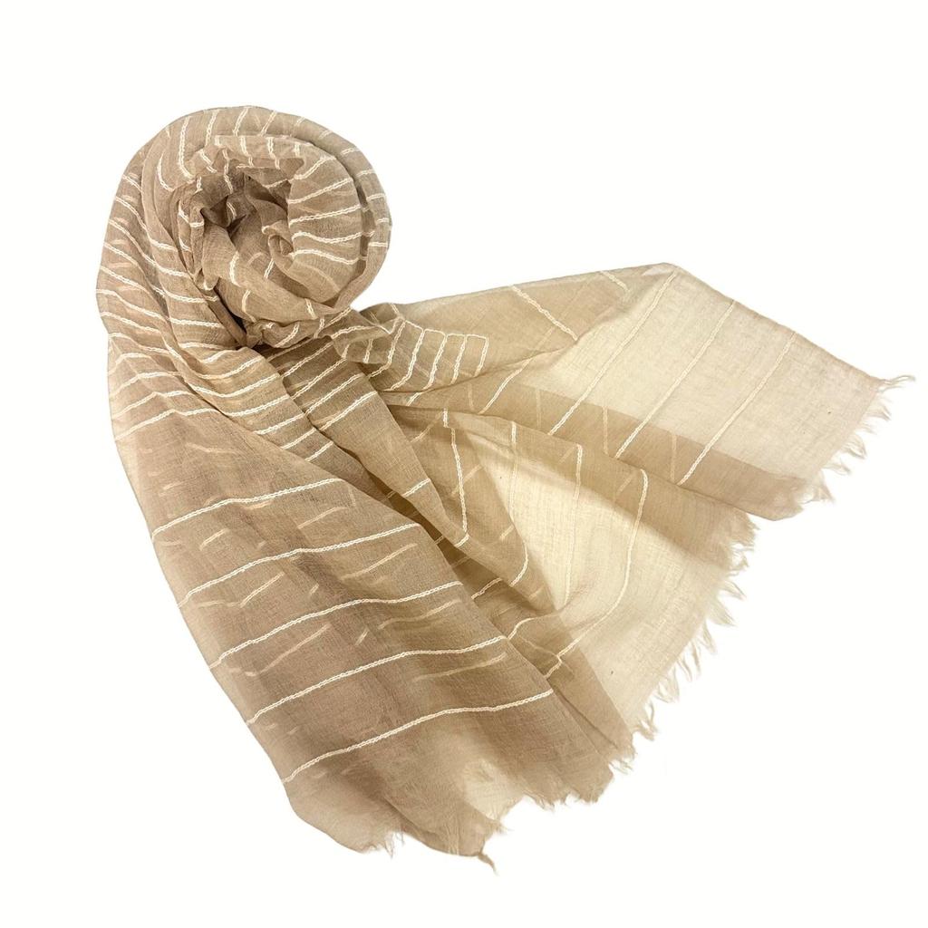 The characteristic of the cashmere chiffon stole is that it is a lightweight stole weighing 50g, woven with extremely fine yarn of 100 count. The border line, which is a key point, is made of silk yarn.