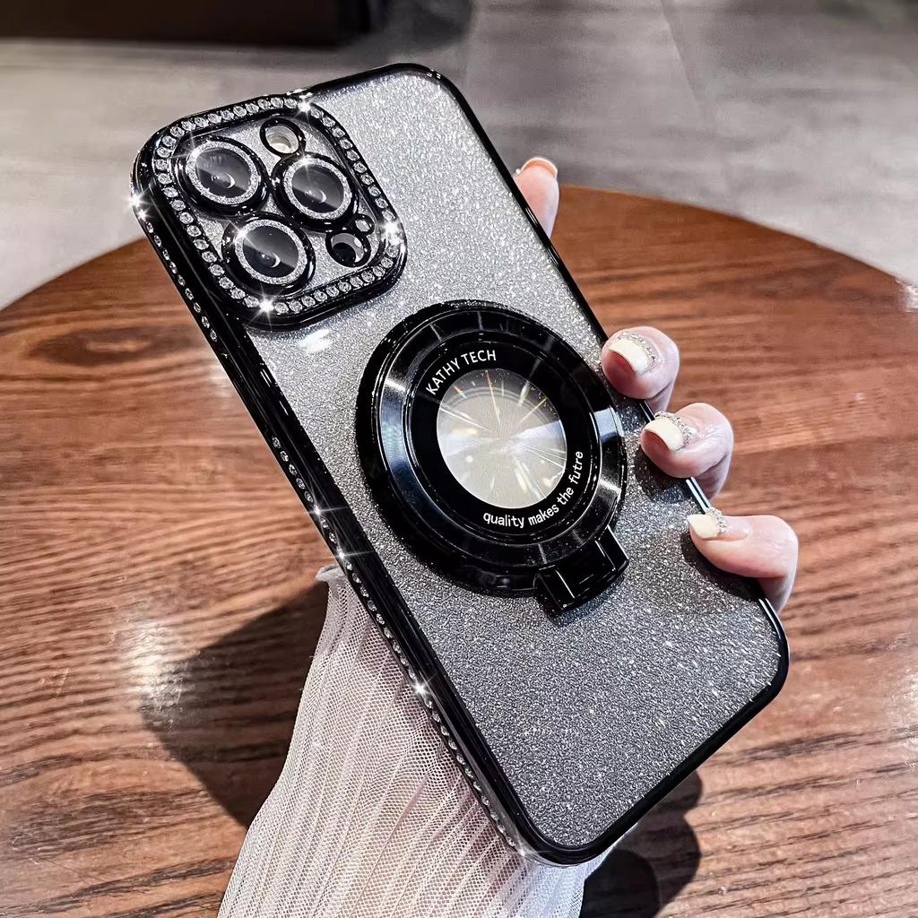 Magnetic Stand Suitable for Apple 16ProMax Gradient Phone Case, Water Diamond Iphone15 Glitter Mirror 14 Protective Case