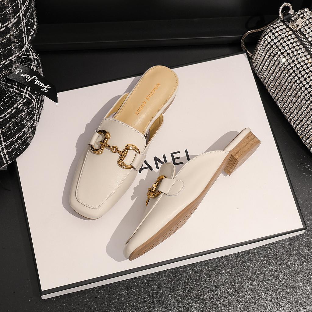 Leather Half Slippers Women's Outer Wear Summer New Horse Buckle Sandals Heelless Lazy Shoes Flat Bag Head Muller Shoes
