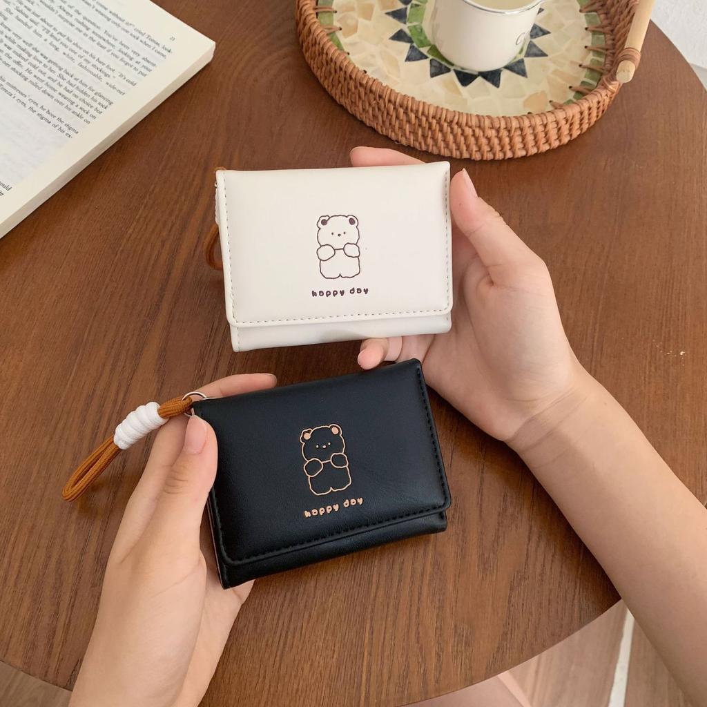 Bear Printed Wallet Ins Female Multifunctional Cute Student Storage Card Pack Triple Fold Lanyard Wallet
