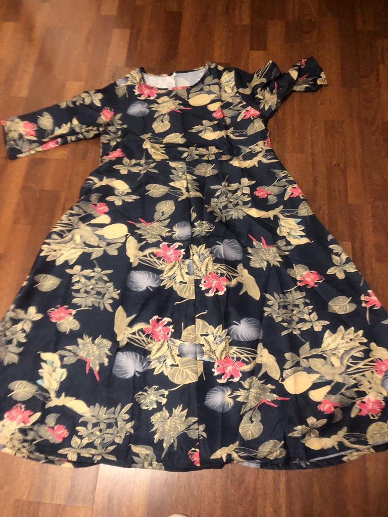 Women's Summer Round Neck 3/4 Sleeve A-Line Skirt Medium Length Printed Loose Dress