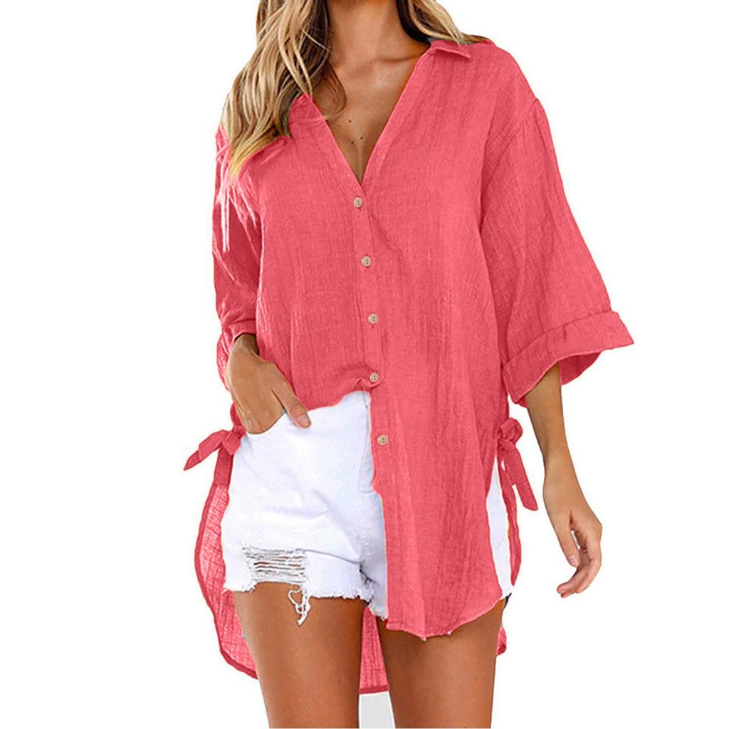 Casual Women Lace-up Button Lapel Shirt Loose Side Knotted Long Sleeve Shirt