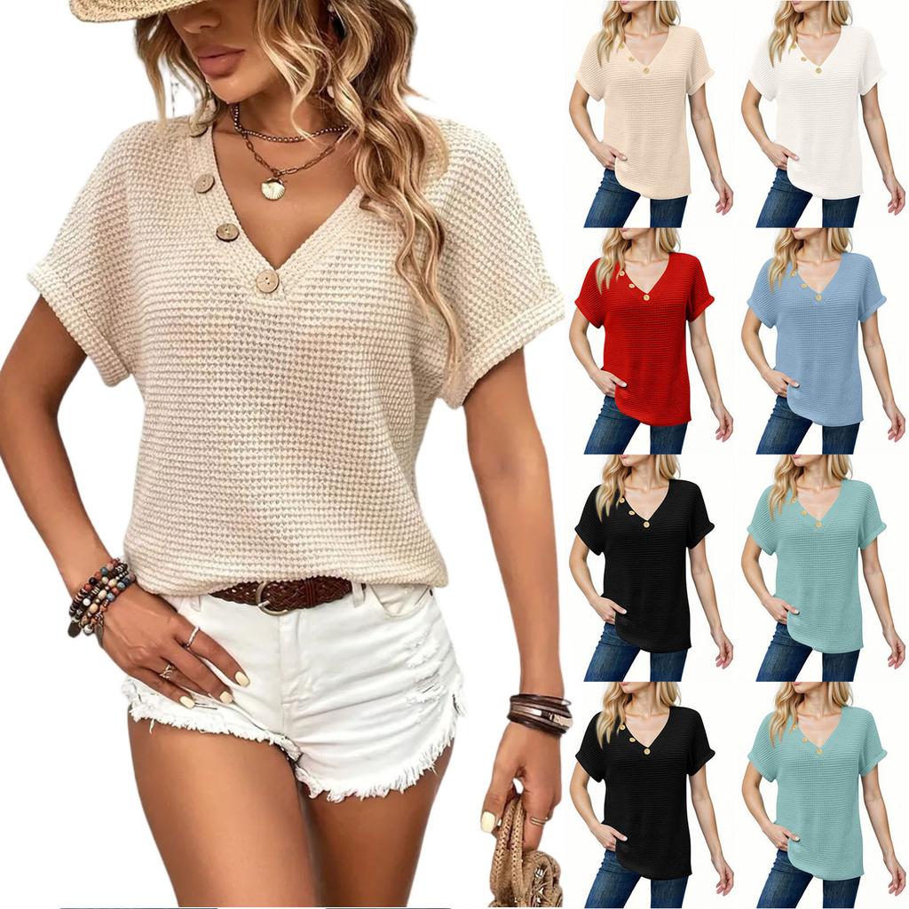 Women's Fashion V-Neck Button Short Sleeve Solid Colour Casual T-Shirt Top