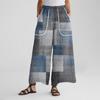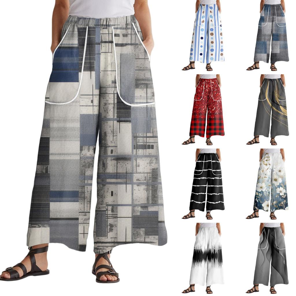 Women's Wide Leg Pants With Elastic Waistband, Retro Printed Large Pockets, Patchwork Loose Pants