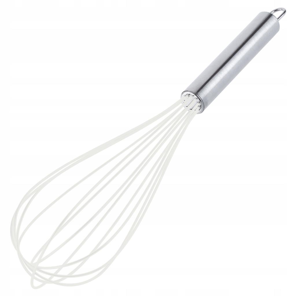Functional and durable whisk from KADAX is the perfect solution in every household, restaurant or confectionery. The product is solidly made, which makes it great for various kitchen activities, such as beating stiffly and steaming, mixing eggs for scrambled eggs or for your favorite, delicious baked goods. The handy handle allows for comfortable use of the item and efficient and quick preparation of dishes and meals.. The item handles mixing ingredients for apple pie, meringue, brownie, peach cake, cinnamon cake perfectly.. It turns out to be a useful tool when preparing family scrambled eggs, allowing for precise and quick mixing of eggs in a cup, pot, or glass.. The ergonomic handle allows for free gripping of the product and whipping of foam. A kitchen accessory useful for every lover of aromatic baking smells and people who value precision in the kitchen. A masher is a convenient accessory when preparing delicacies, especially for people who don't spend a lot of time in the kitchen, so a thrifty and simple item will suffice for them completely.. The article at the end of the handle is equipped with a small loop, which allows the product to be hung on a hook.. The item fits successfully in the kitchen cabinet, facilitating quick access to the whisk. The product fits the fingers well, not causing chafing on the hand caused by use.. The stainless steel handle of the item makes it easy to clean from dirt or residue from foam or dough.. Additionally, the product is corrosion-resistant, allowing for comfortable use in humid rooms such as the kitchen at home or in a bakery.. The article is durable and robust, has excellent mechanical properties, and protects against impacts, abrasion, or scratches.. It makes a nice decoration, drawing attention with its shine and unusual appearance.. The product's construction guarantees effective protection against germs and bacteria. The item does not absorb odors and does not react with acids. The silicone tip with five wires protects the dish from scratches, does not wear out, does not corrode, and is easy to wash. The dimensions of the item are 8 cm in length, 8 cm in width, and 30 cm in height.. The large whisk allows for easy mixing of ingredients and proper preparation for a family event, a meeting with friends, or a birthday..