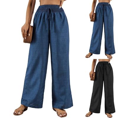 Women Casual Solid Cotton Linen Drawstring Elastic Waist Long Wide Leg Pants