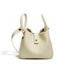 This bag has a stylish, bucket - shaped silhouette crafted from top - layer cowhide leather. It features a textured, pebbled surface, dual short handles, and an adjustable shoulder strap, giving it a refined, modern look that suits various styles.