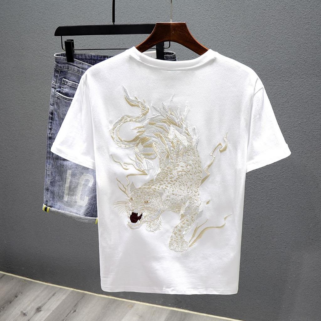 Summer New Style Men's Short Sleeve T-shirt Heavy Industry Embroidery China-Chic Loose Top Tiger Embroidery Chaopai Half Sleeve
