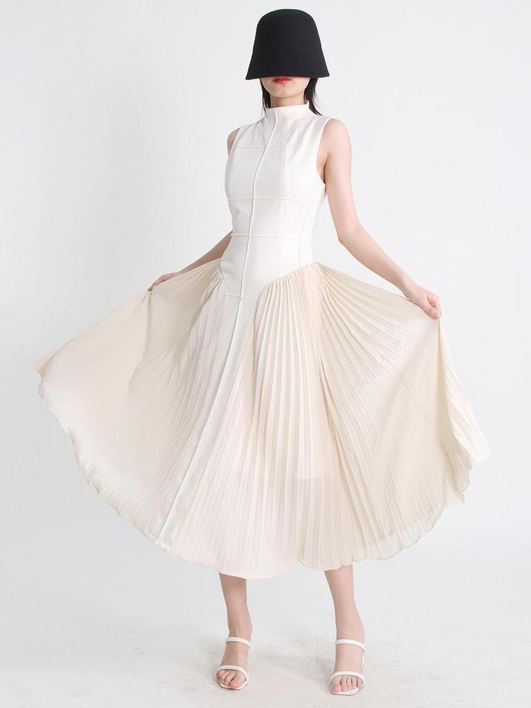 2025 Spring French Style Sleeveless Contrast Stitch Pleated Dress