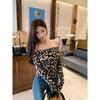 In-Stock Spicy Leopard Print Off-Shoulder Top: Waist-Cinching, Slimming, Long-Sleeved T-Shirt