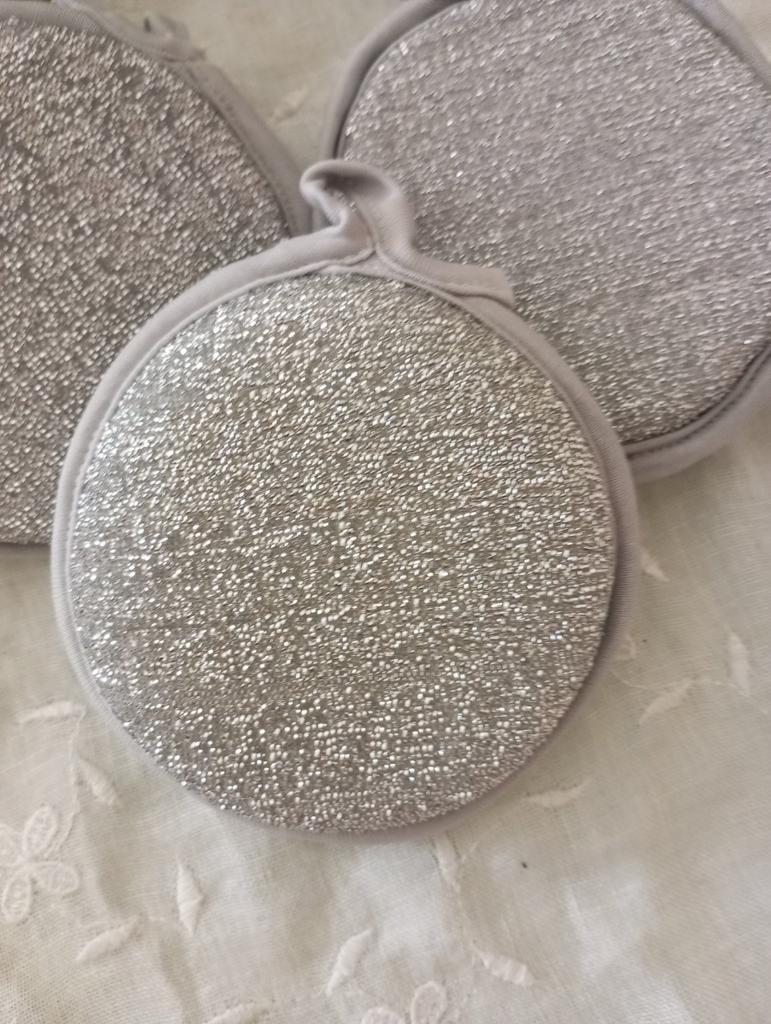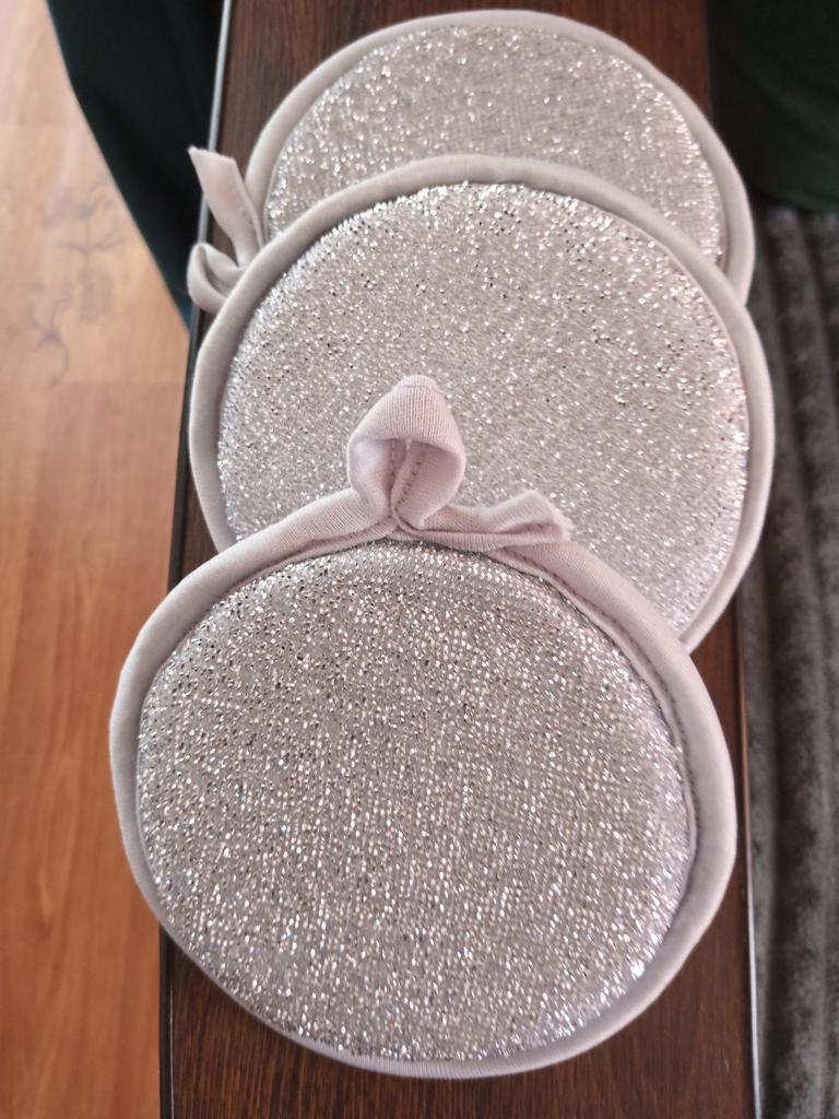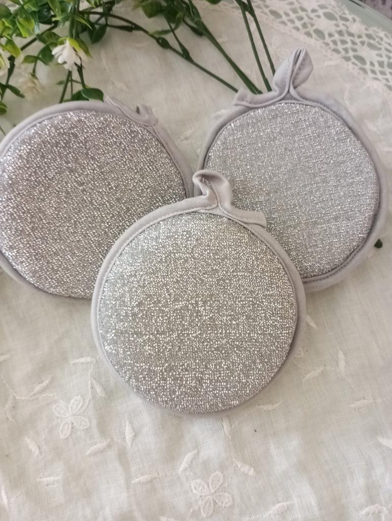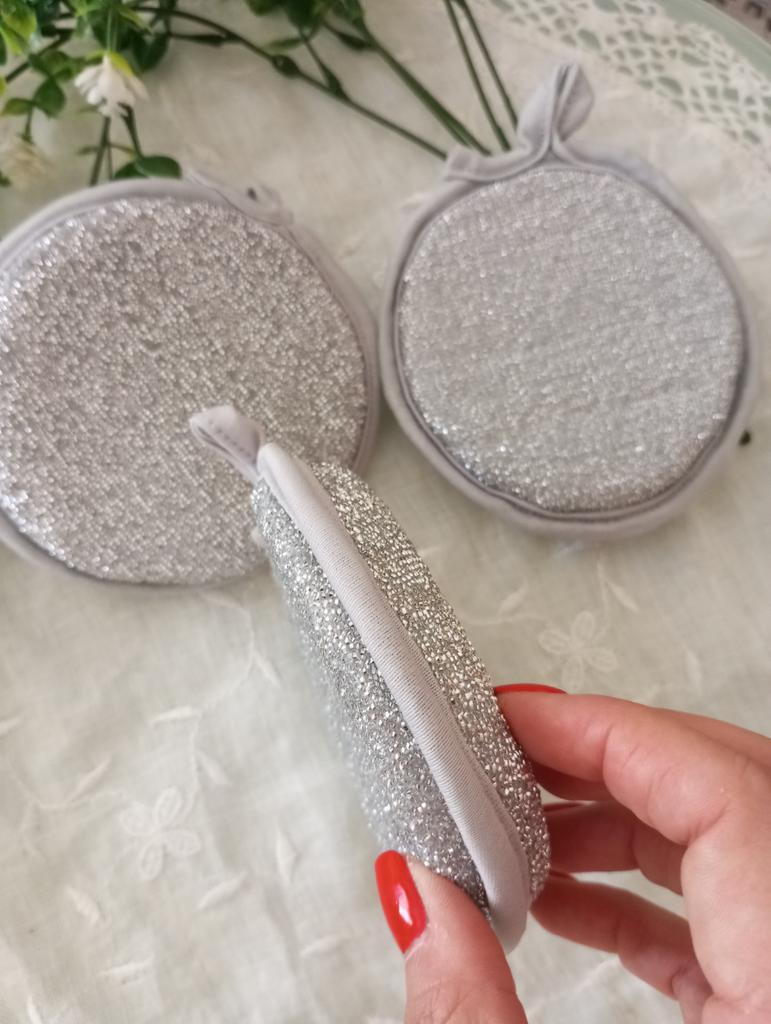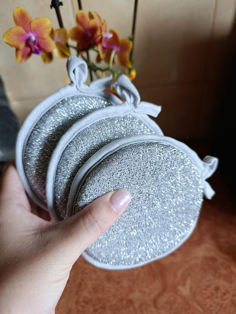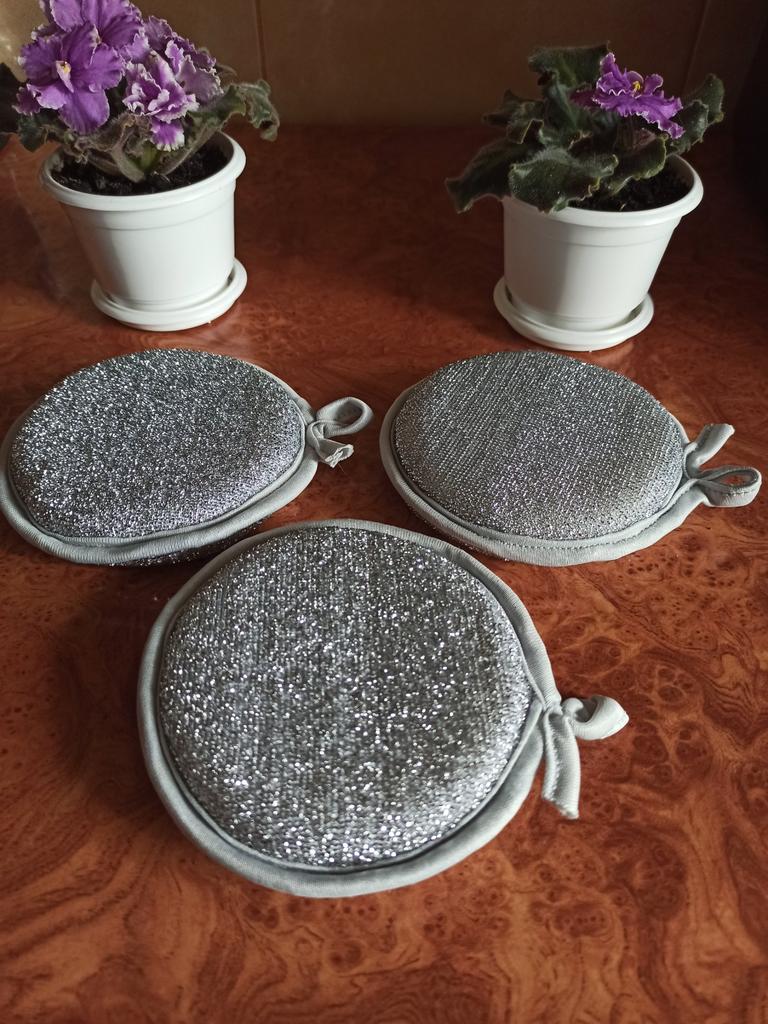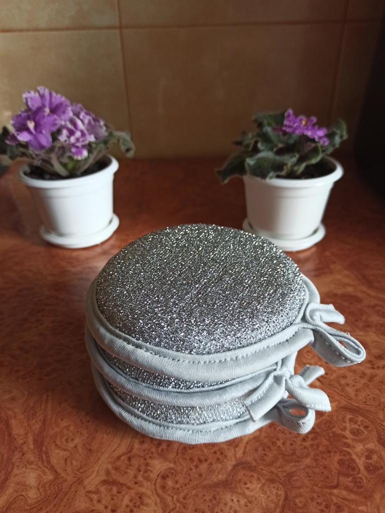 Double-sided metal sponges for washing dishes The set includes 3 pieces. You can use this sponge to wash dishes, gas stoves, clean pots, pans, etc.. When you apply detergent to the sponge, it foams up nicely.. The sponge is made qualitatively: the edges of the sponge are trimmed with braid, so it will not unravel.. Also for convenient storage there is a loop for hanging it. The sponge does its job perfectly. I am happy with the order. I will order more. And I recommend it to you 👍