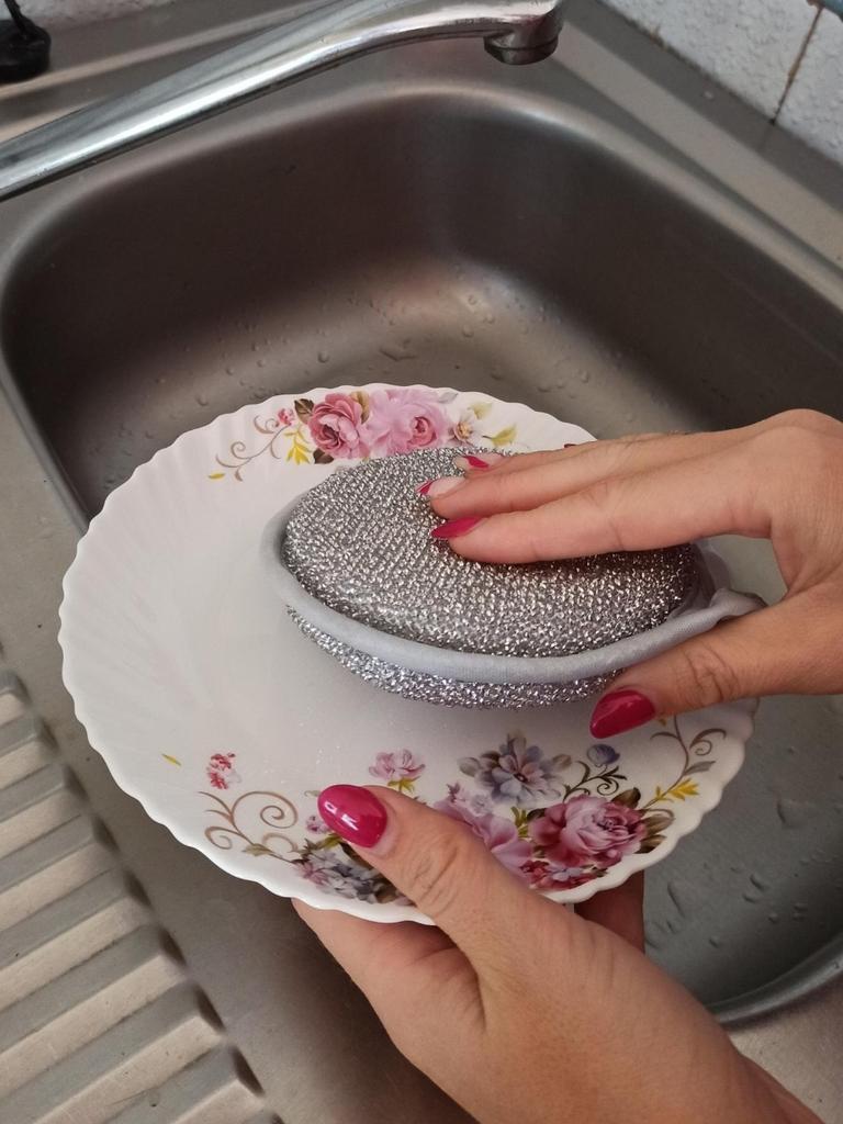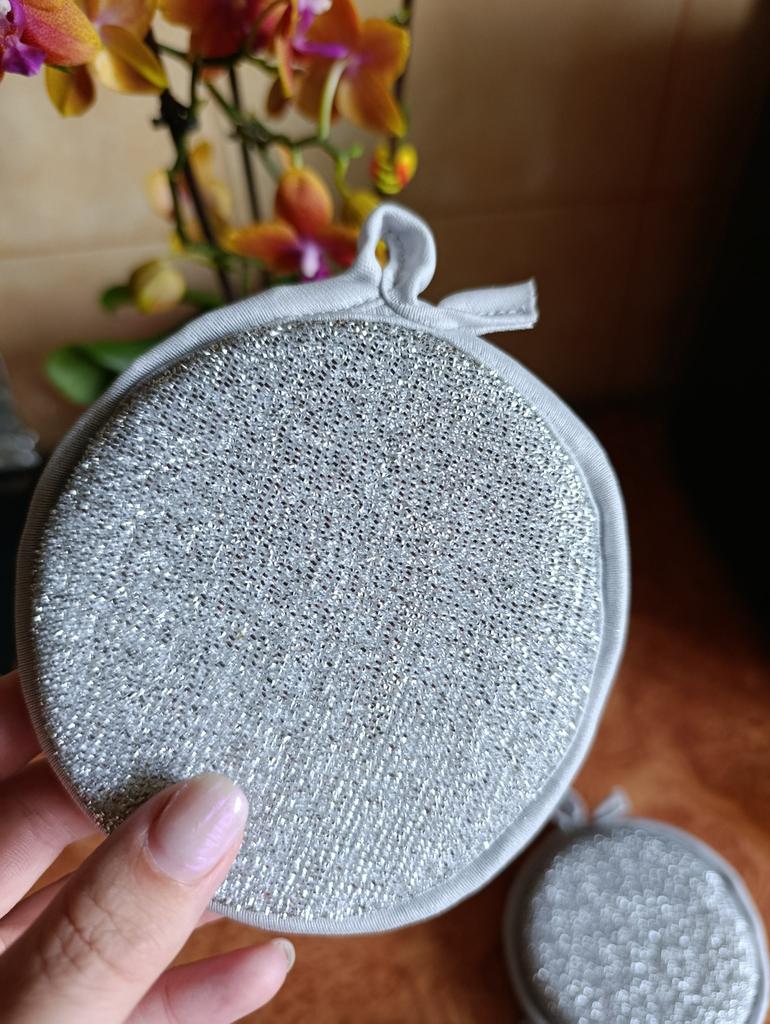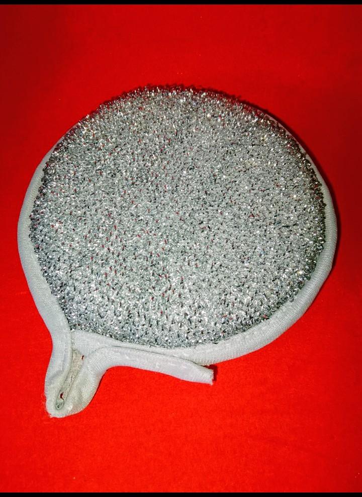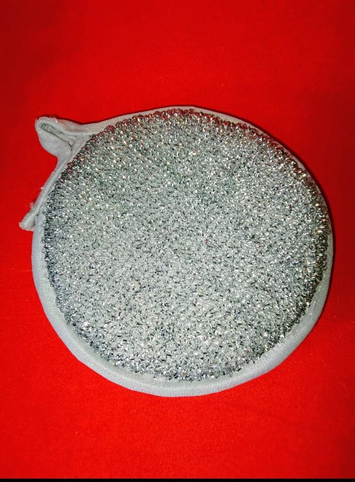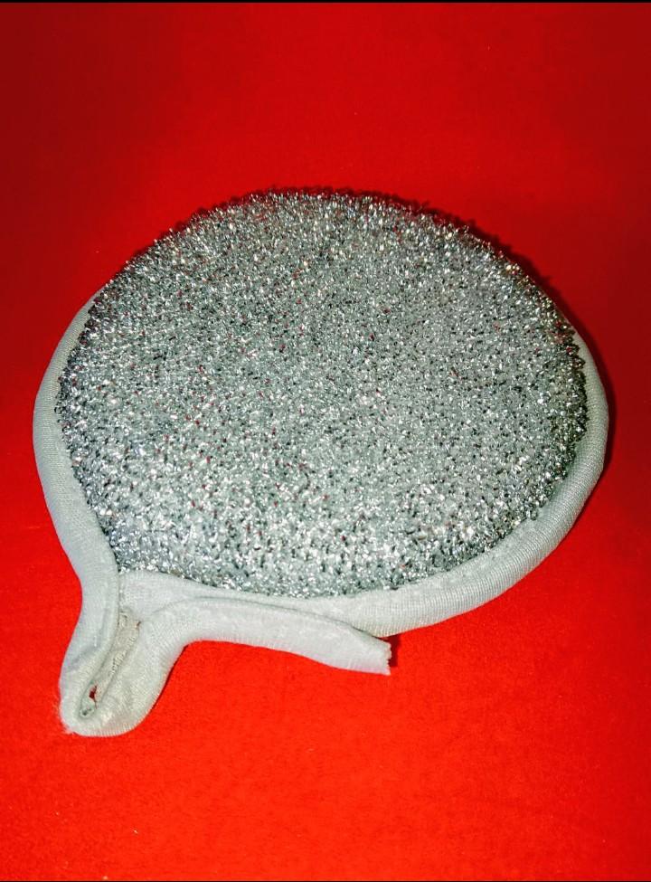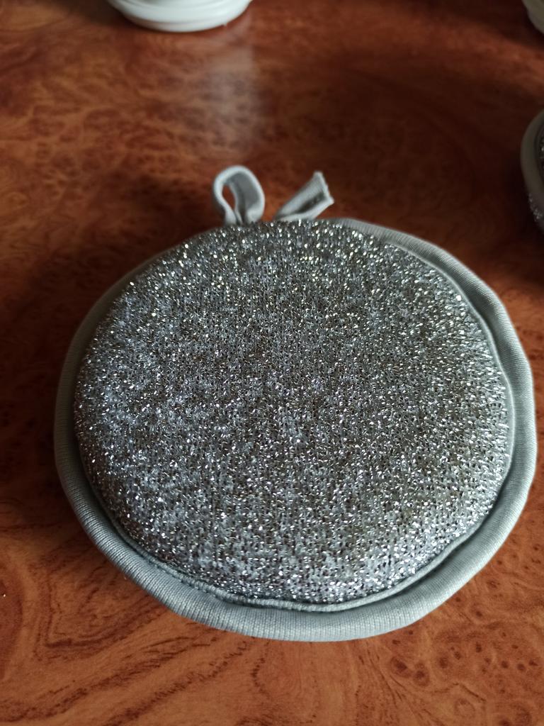 Double-sided metal dishwashing sponge You can use this sponge to wash dishes, gas stoves, clean pots, pans, etc.. When you apply detergent to the sponge, it foams up nicely.. The sponge is made qualitatively: the edges of the sponge are trimmed with braid, so it will not unravel. Also for convenient storage there is a loop by which it can be hung.. The sponge does its job perfectly. There are 3 pieces in the set Satisfied with the order. And I recommend it to you 👍
