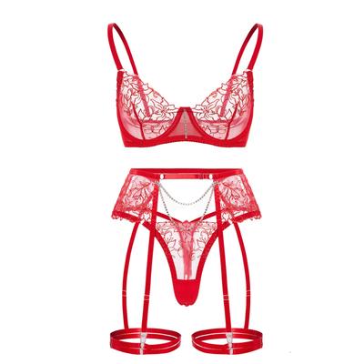 Women's Sexy Lingerie Sexy Belt Metal Chain Embroidery Sexy Lingerie Four-piece Set