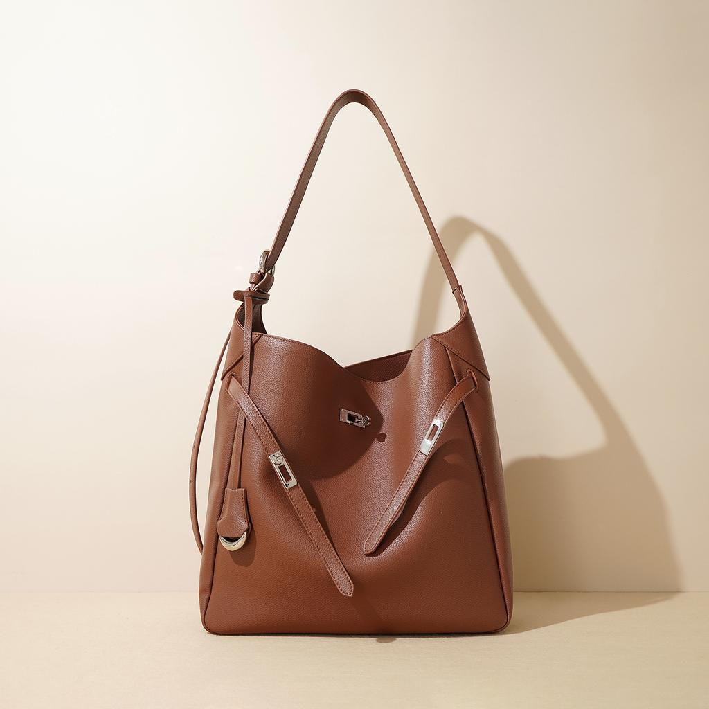 This bag has a stylish, slouchy silhouette crafted from cowhide leather. It features a smooth texture, a spacious top opening, a decorative strap detail, and an adjustable shoulder strap. The casual yet elegant design makes it a standout accessory.