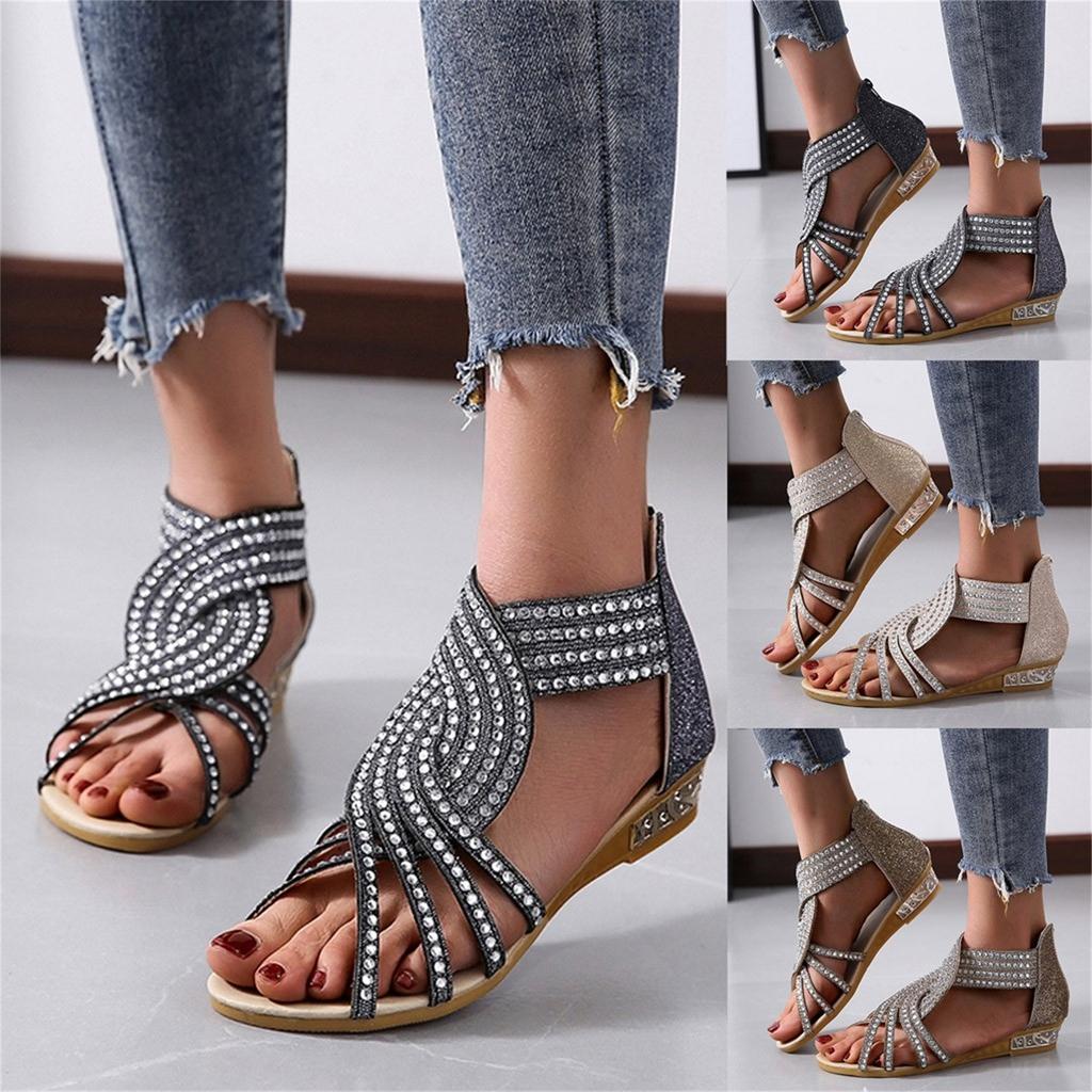 Sandals Women Women'S Ladies Fashion Vintage Crystal Outdoor Hollow Out Zip Up Sandals Shoes Womens Sandals Pu