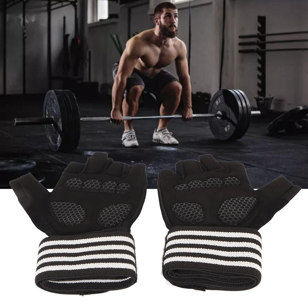 Black Workout Gloves Gym Fitness Weight Lifting Half Finger Gloves with Wrist Strap for Exercise Training L