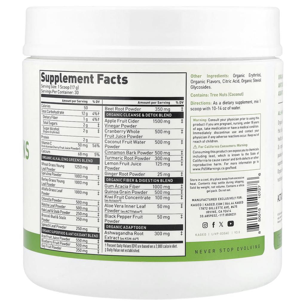Product Description: Natural FlavorsSupplementsVegan FriendlyNon-GMOGluten FreeFruits + VegetablesGreens + GrassSuperfoods + AntioxidantsOrganicDigestive SupportDetoxAdaptogensNever Stop MovingActazin™Activaloe®KSM-66 Ashwagandha®Never Stop MovingAll-in-One Superfood Supplement Organic Greens is a delicious superfood drink that replenishes missing nutrients, promotes gut and immune health, and gives you a natural energy boost. Made with 26 organic fruits, vegetables, and herbs, it contains the cleanest greens, reds, superfoods, prebiotics, and adaptogens on the planet. Balance your daily nutrients with convenient, delicious one-scoop servings of Organic Greens. Organic Greens & Sprouts Wheatgrass, Spirulina, Barley Grass, Alfalfa Grass, Chlorella, Matcha, Kale, Broccoli, Spinach Organic Superfoods Acai, Blueberries, Goji Berries, Aloe, Kiwi, Beetroot Organic Cleanse Ingredients Apple Cider Vinegar, Cranberries, Turmeric, Lemon, Ginger, Cinnamon Organic Adaptogens KSM-66® Ashwagandha