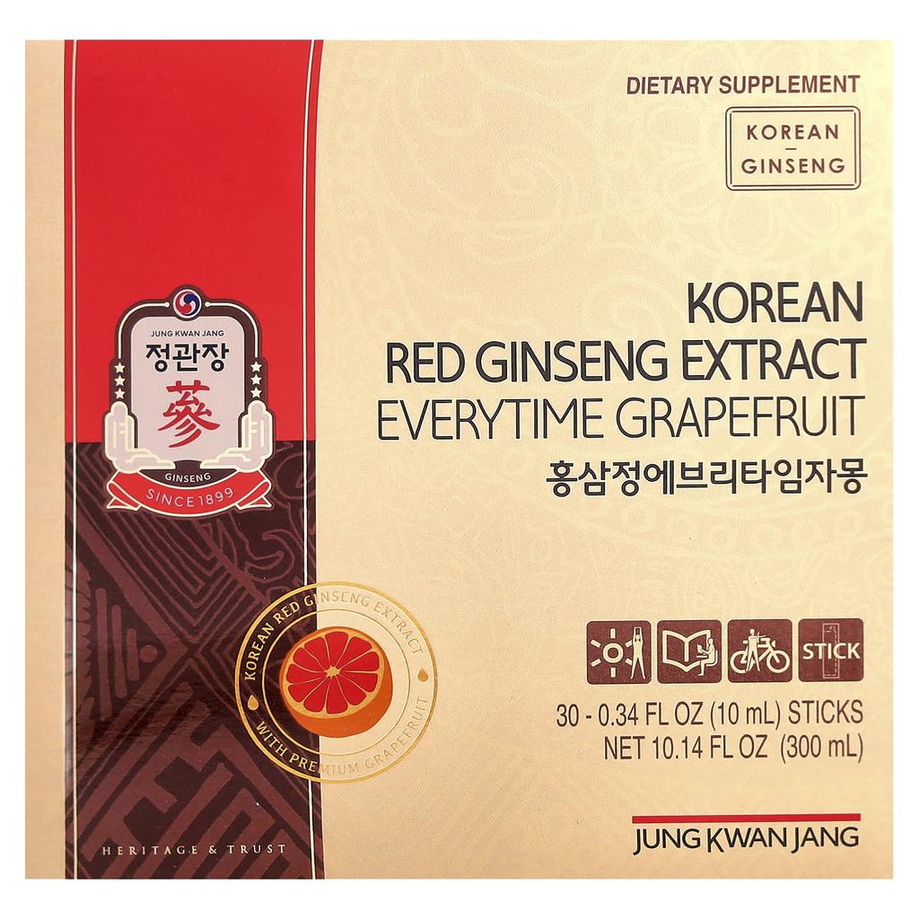 Product Description: Supplements Established in 1899 Premium Grapefruit Contains Korean Red Ginseng Extract Heritage and Trust Aiming for Better Life Work Play Boosts Immunity Boosts Healthy Energy Levels Healthy Blood Circulation Supports Healthy Brain Function Premium Quality: Each stick contains 1,000mg of high-quality Korean Red Ginseng Extract. Our extract is made from carefully selected ginseng roots, concentrating the powerful benefits and potency that Jeonggwanjang is known for. Refreshing Grapefruit Flavor: The delicate, tangy taste of grapefruit provides a refreshing dose of ginseng without the traditional taste in every sip. A delicious, healthy snack that is satisfying to both your taste buds and your body. Convenient, Portable Wellness: Our liquid extract comes in a convenient, portable stick form for easy, convenient consumption. Maintaining a wellness regimen has never been easier, whether you’re at home, in the office, or on the go. Energy the Natural Way: Ginseng is known for its natural ability to boost energy levels, support immune function, and promote overall health. Our Grapefruit Flavored Ginseng Sticks are a great way to feel energized and powerful when taken with your daily routine. No Artificial Flavors or Colorants: Committed to maintaining the purity and effectiveness of our products, these liquid essence sticks are free of artificial flavors, colors, or preservatives, bringing you the best of nature. The World’s #1 Ginseng Brand: Source | Euromonitor International Limited Vitamins & Supplements Category Retail Price %1, 2014-2023 Data. Channel 2024 Edition