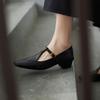 Vintage Camellia Mary Jane Women's Shoes Spring and Autumn Brown T-word with Thick Heel Single Shoes Medium Heel Small Leather Shoes