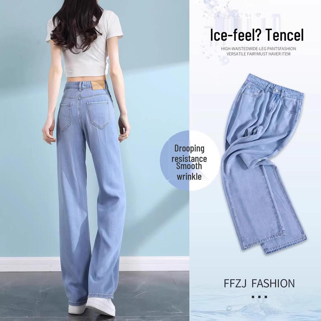 Experience ultimate comfort and style with these Women's Summer 2025 straight-leg jeans crafted from cool, breathable lyocell fiber. Designed with a high waistline, these light blue ice silk jeans effortlessly blend a sporty edge with a chic, modern silhouette. Ideal for keeping you cool and fashionable during warm summer days, they provide excellent flexibility and comfort for any casual outing or sporty activity.