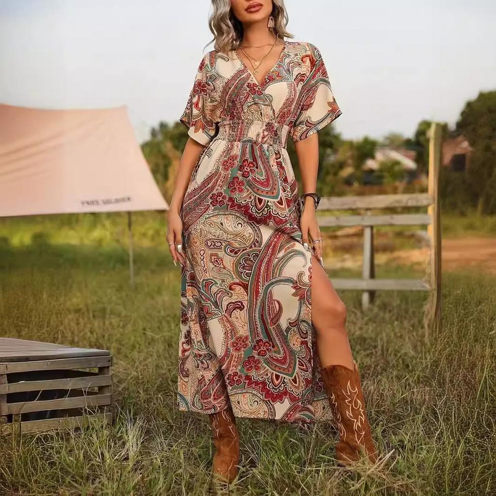 Women Casual Short Sleeve V Neck Bohemian Holiday Style Retro Flower Printed One Piece Dress