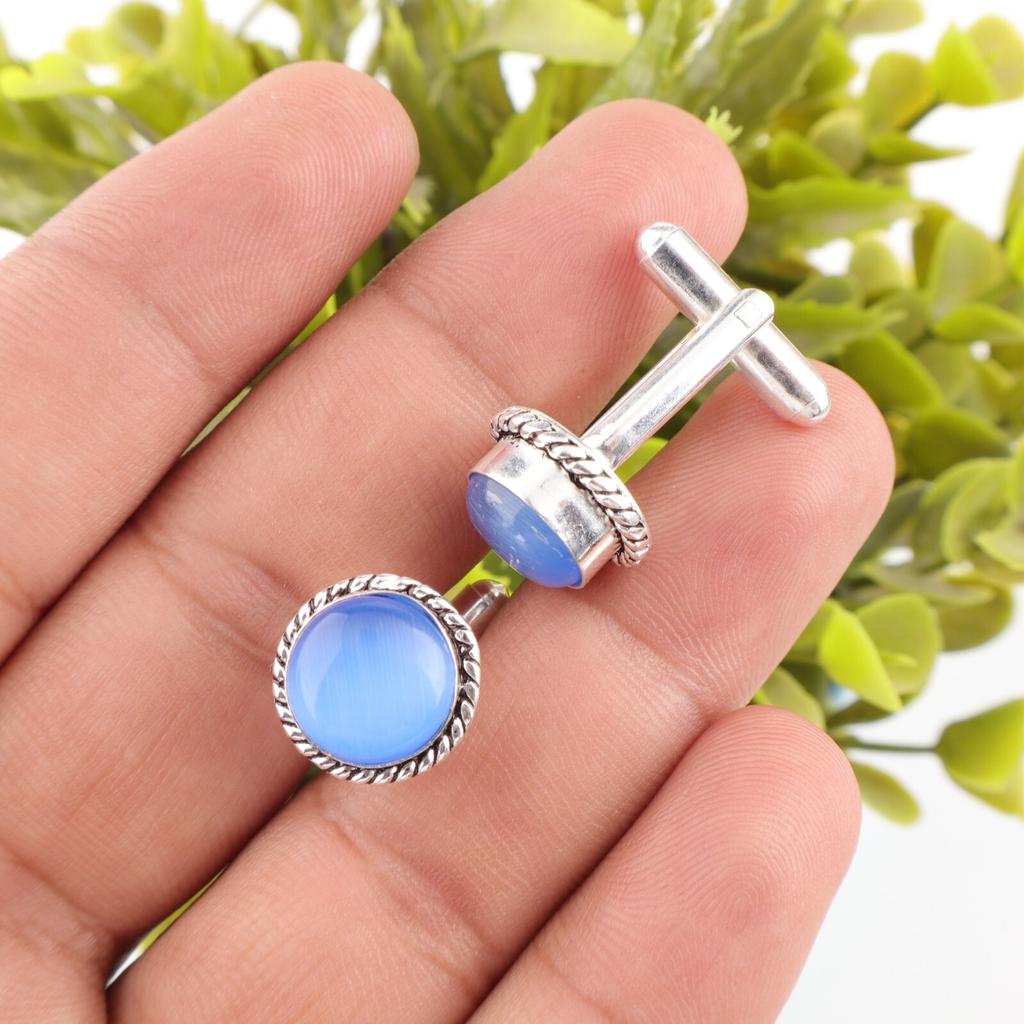 Dark Blue Cat's Eye Gemstone 925 Sterling Silver Jewelry Handmade Cufflinks0.51" CL-3-24