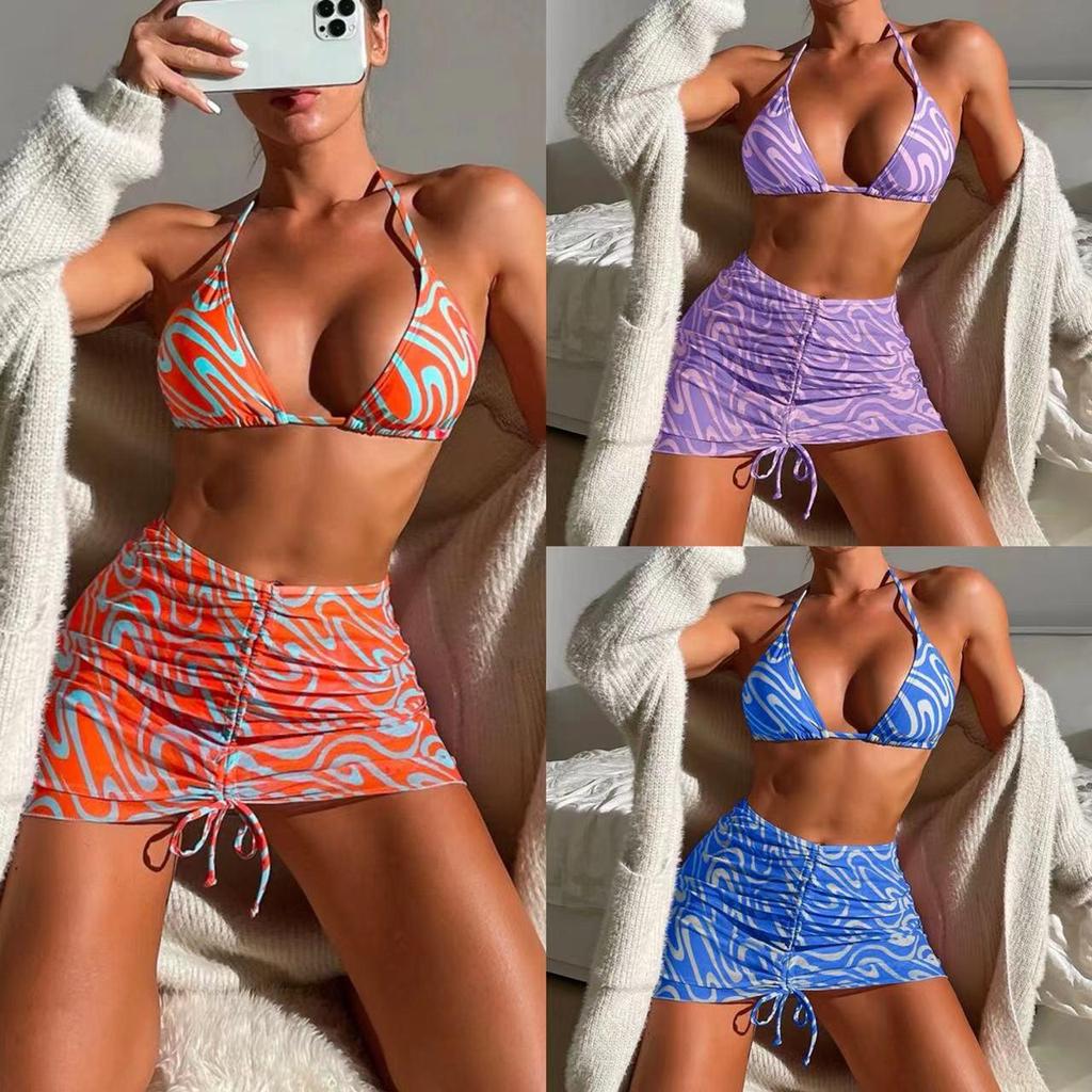 2024 European & American Full Print Halter Triangle Bikini Swimsuit with Beach Dress