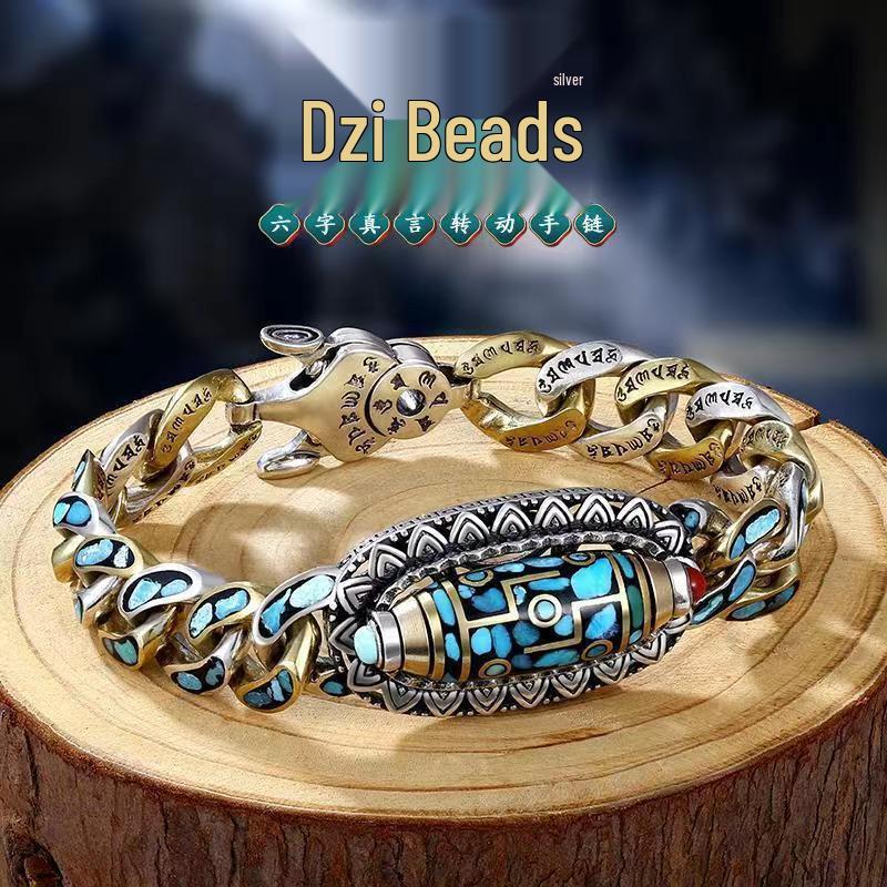 Turquoise Nine-Eyed Dzi Silver Bracelet for Men's Luck & Women's Style