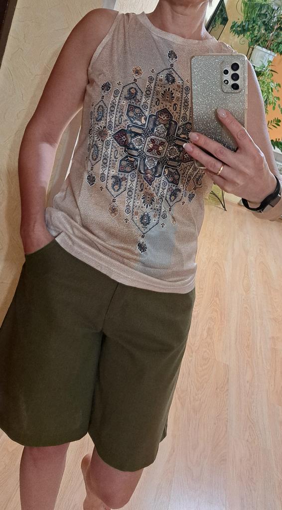 Size S fit bust -90 well, it's synthetic of course, but I like it - it dries quickly, doesn't wrinkle - I love that kind of thing. It looks nice. But the color is completely different, not a green shade, but rather beige with gold. It's sad, because I wanted it like in the picture, but the Chinese are always a lottery)))