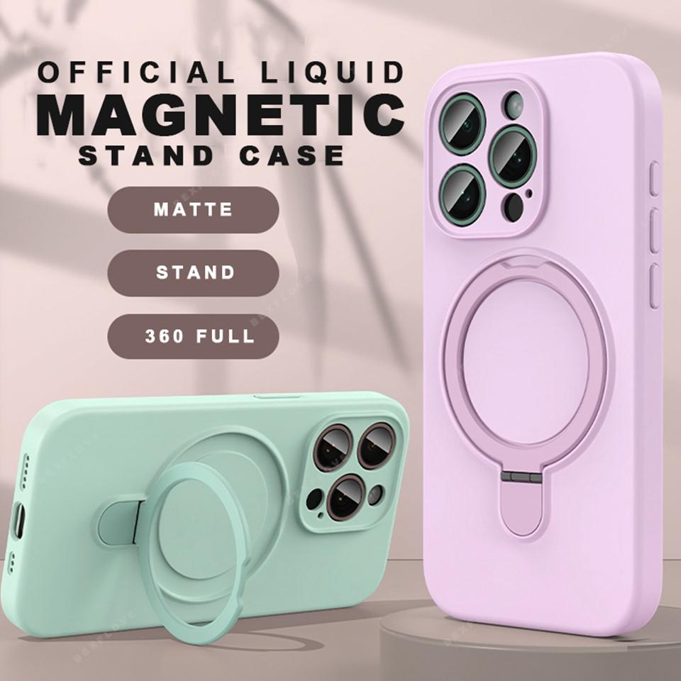 Magnetic Ring Holder Liduid Silicone Stand Phone Case For iPhone 15 14 16 Plus 11 12 13 16 Pro Max Magsafe Protector Soft Cover